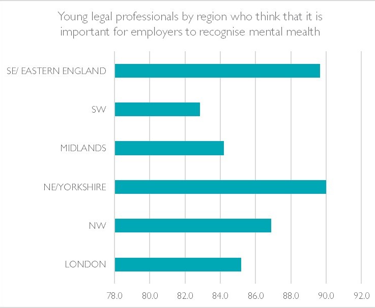 Returning to young legal professionals, and drilling down further into location, though over 80% believed mental health and wellbeing support to be important nationally, there were slight regional differences in our < 2 years PQE and Trainee sample. Those based in the North East and Yorkshire followed by those in the South East and Eastern England were more likely to believe it important. The lowest % was within the South West, the area of the UK that was deemed by our general results (as released earlier this year) to be the happiest in their jobs nationally.