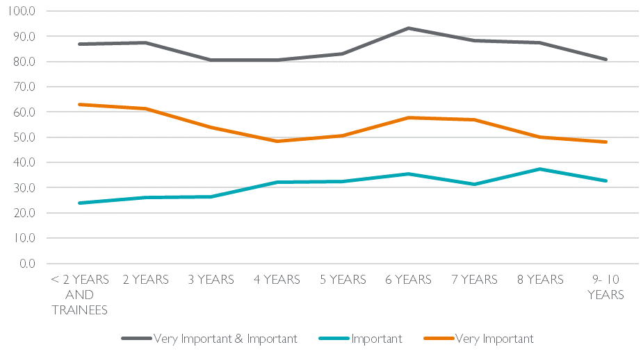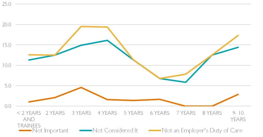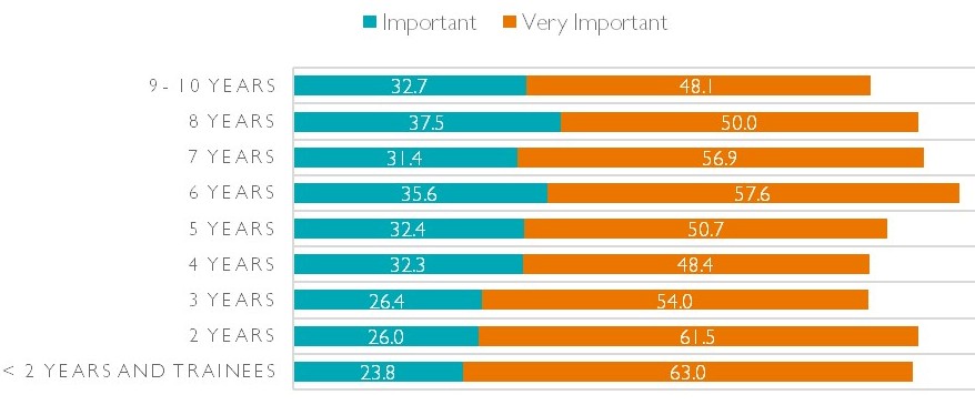 In terms of support within the workplace, as predicted, the highest % of lawyers who felt it was “very important” that employers had provisions to aid the mental health of their workers were of the < 2 year PQE and trainee group. This then fell as experience increased. However, in combining the “very important” and “important” answers a different and more varied generational picture emerges. This sees the highest % of lawyers believing employer led mental health support to be important within the 6 years PQE group. A notable increase in the more apathetic and “not important” responses seemingly occurs between the 3-4 years PQE field which rises again after 8 years PQE.