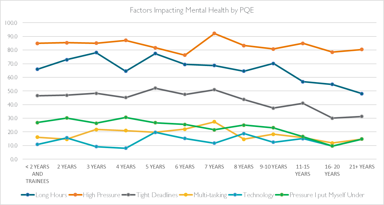 High pressure, the most commonly cited factor peaked at 7 years PQE, whereas long hours were documented as the highest reason at 3 years and 5 years PQE. Worries around tight deadlines and self-compounded pressure both appeared to fall gradually as the PQE level of our respondents increased.