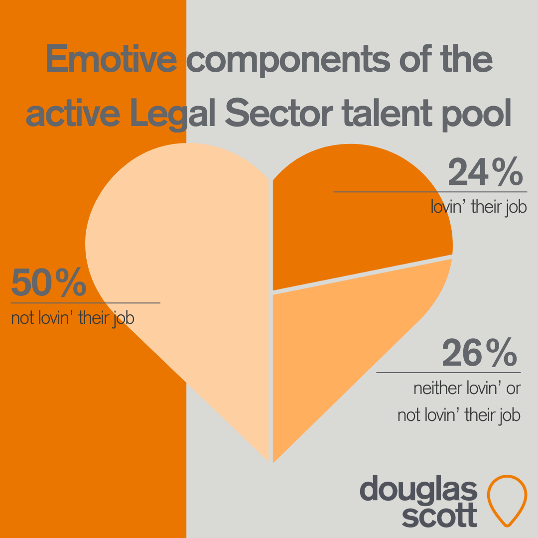 It goes without saying that if you are loving your work you are less likely to be looking to change jobs and the data from our 2024 Salary and Benefits Survey backs it up. This year 25% of the legal talent pool is actively looking to change jobs, slightly up on 2023. 50% of that active element of the talent pool is made up of legal professionals who are not happy in their work, 24% who are lovin’ their work and the remaining 26% is formed from lawyers who are neither happy or unhappy in their roles.