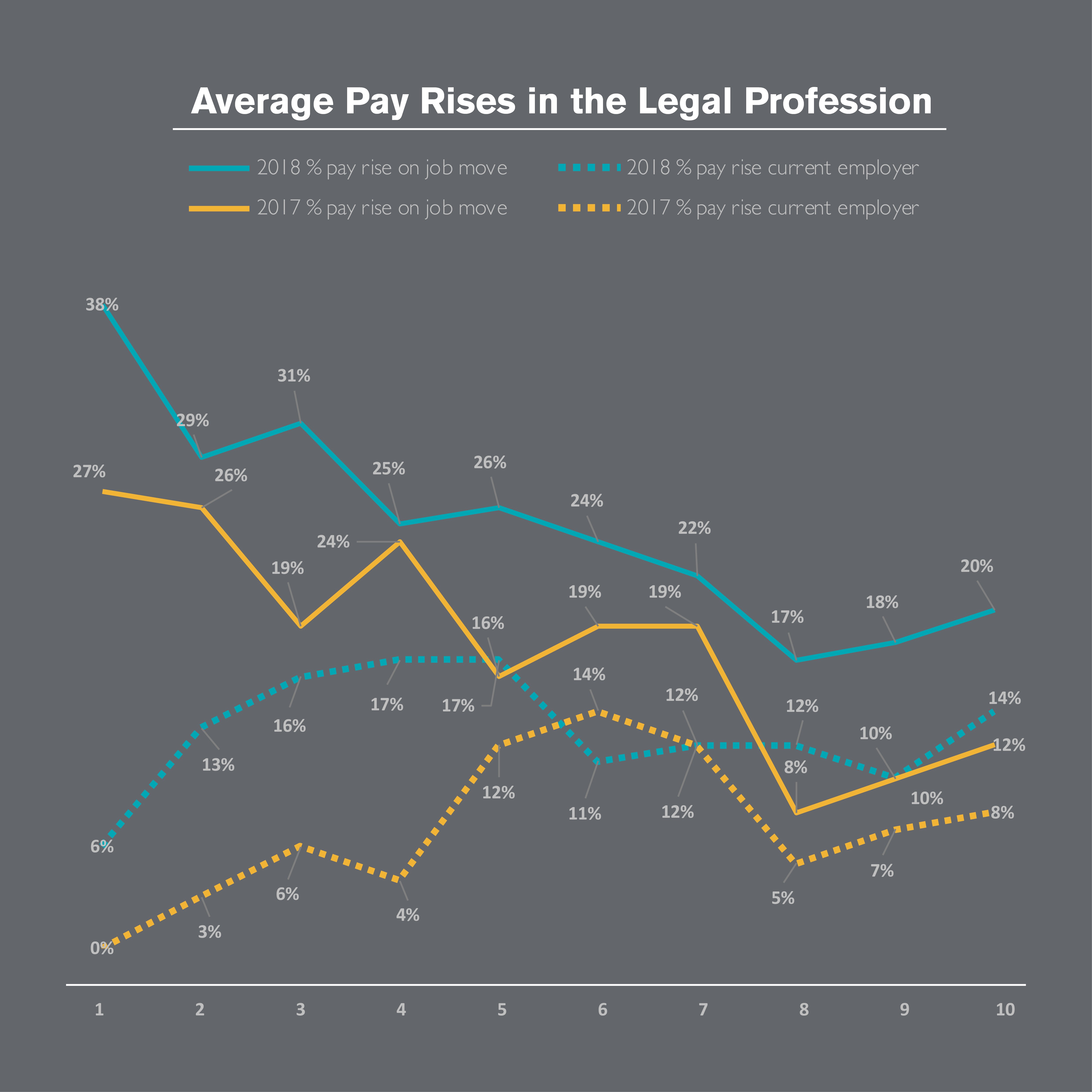 Employers have reacted by almost doubling pay rises awarded to lawyers in the first ten years of their careers from an average 7% in 2017 to 13% in 2018. Hirers have also proved bullish with average pay rises secured on a legal job move in the same period rising from 18% in 2017 to 25% in 2018. The net result is that hirers have extended the overall gap from 11% to 12% between 2017 and 2018.