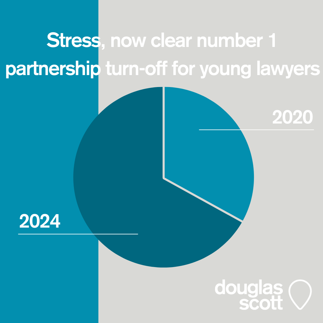 Post Covid, Stress has become the clear, number one Partnership turn off for Young Lawyers. Back in 2020, 22% cited Work Life Balance as their main Partnership turn off. In the last 5 years the story has changed dramatically, and in 2024 the top Partnership turn off for Young Lawyers is Stress. This is particularly pronounced amongst Young Female Lawyers, with 31% citing the pressure as the main reason they are flipping the switch on Partnership ambitions.