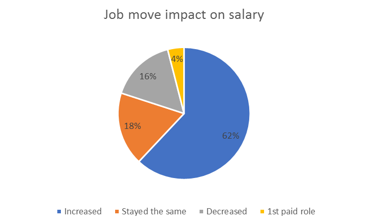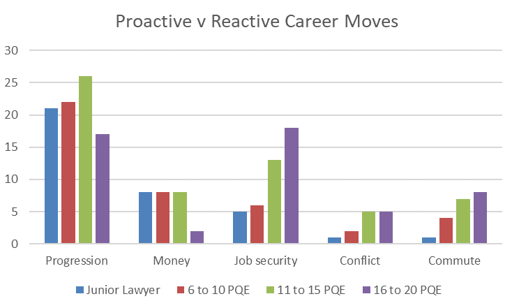 It reduced in more experienced professionals, with only 15% of solicitors with 16-20 years PQE moving for career progression. But solicitors with upwards of 11 years PQE are twice as likely to change their job because of the commute than junior lawyers. They are also 4 times more likely to move firms because of conflict or office politics.