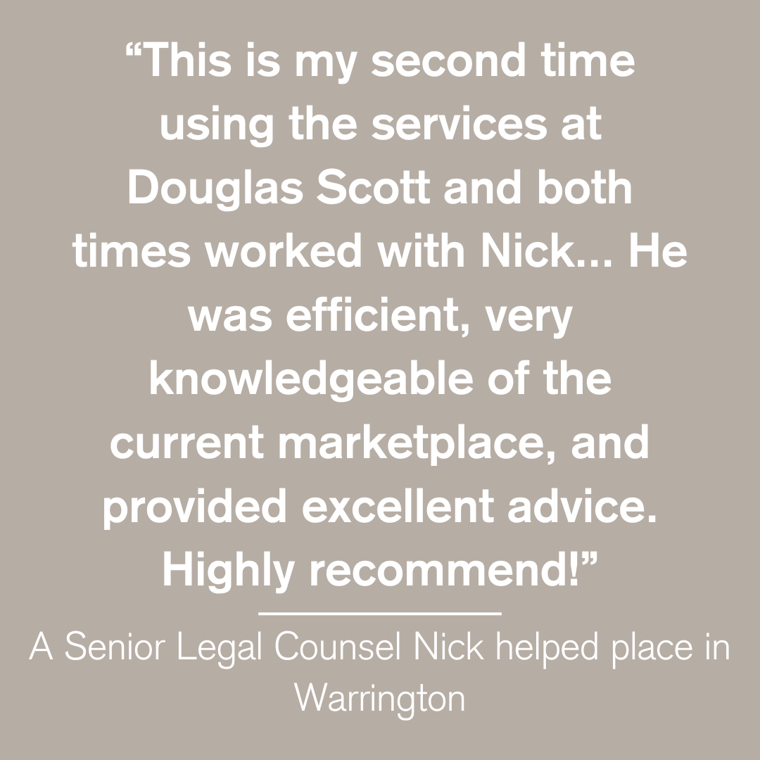 Nick Barrass, Head of In-House at Douglas Scott for over 9 years, specialises in recruiting across the North of England, covering a wide range of sectors and candidate levels, from Paralegals to General Counsel. He works with both established Legal teams and companies looking to build new in-house legal functions. Before joining Douglas Scott, Nick spent 2 years at a Financial Services for a major Bank and 6 years in Real Estate Finance recruitment. He holds a degree in Sport and Exercise Science from Liverpool John Moores University. Nick's clients appreciate his dedication, with one remarking, "You and Lara have both been a pleasure to deal with."